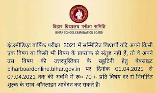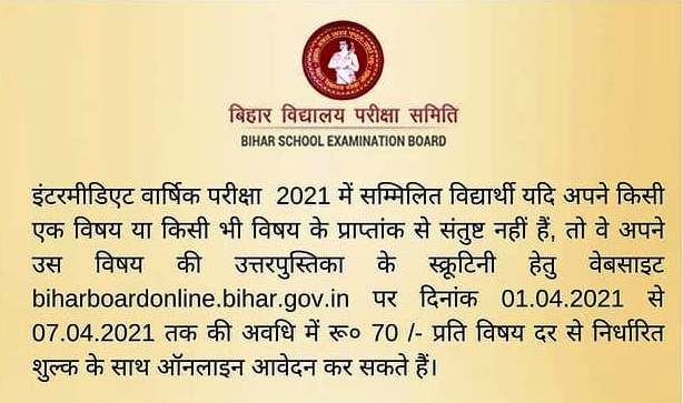 साम्मिलित छात्र और  छात्रा यदि आप एक या एक  अधिक किसी भी विषय के प्रतापअंक से संतुष्ट नहीं है तो वो अपना उस विषय की उतरपुस्तिका के स्कूटनी हेतु वेबसाइट। http://biharboardonline.bihar.gov.in/ पर दिनांक
