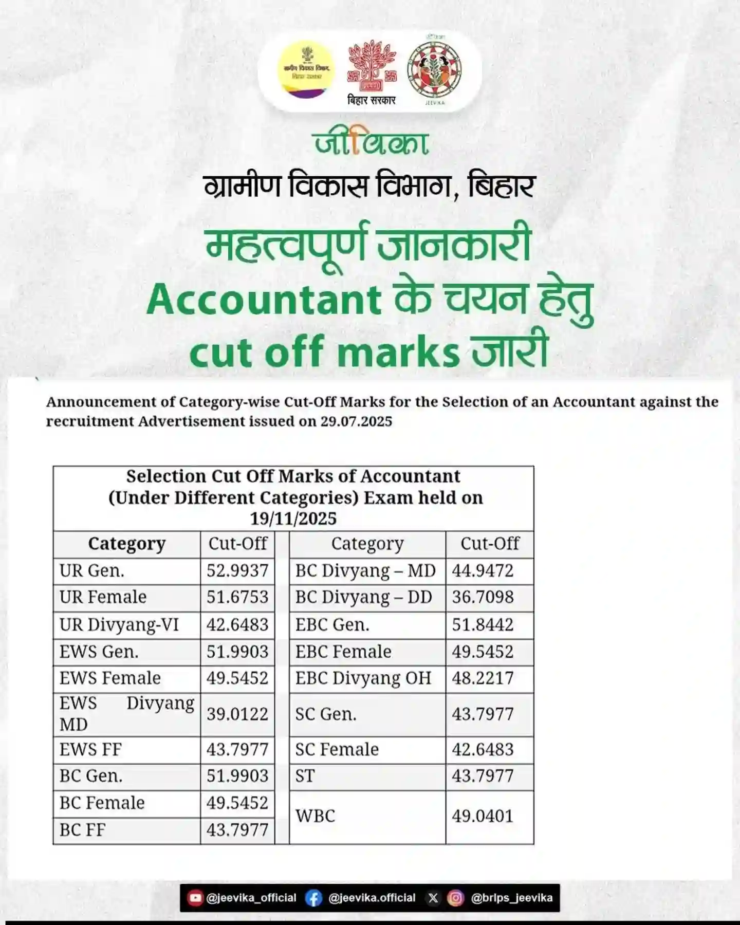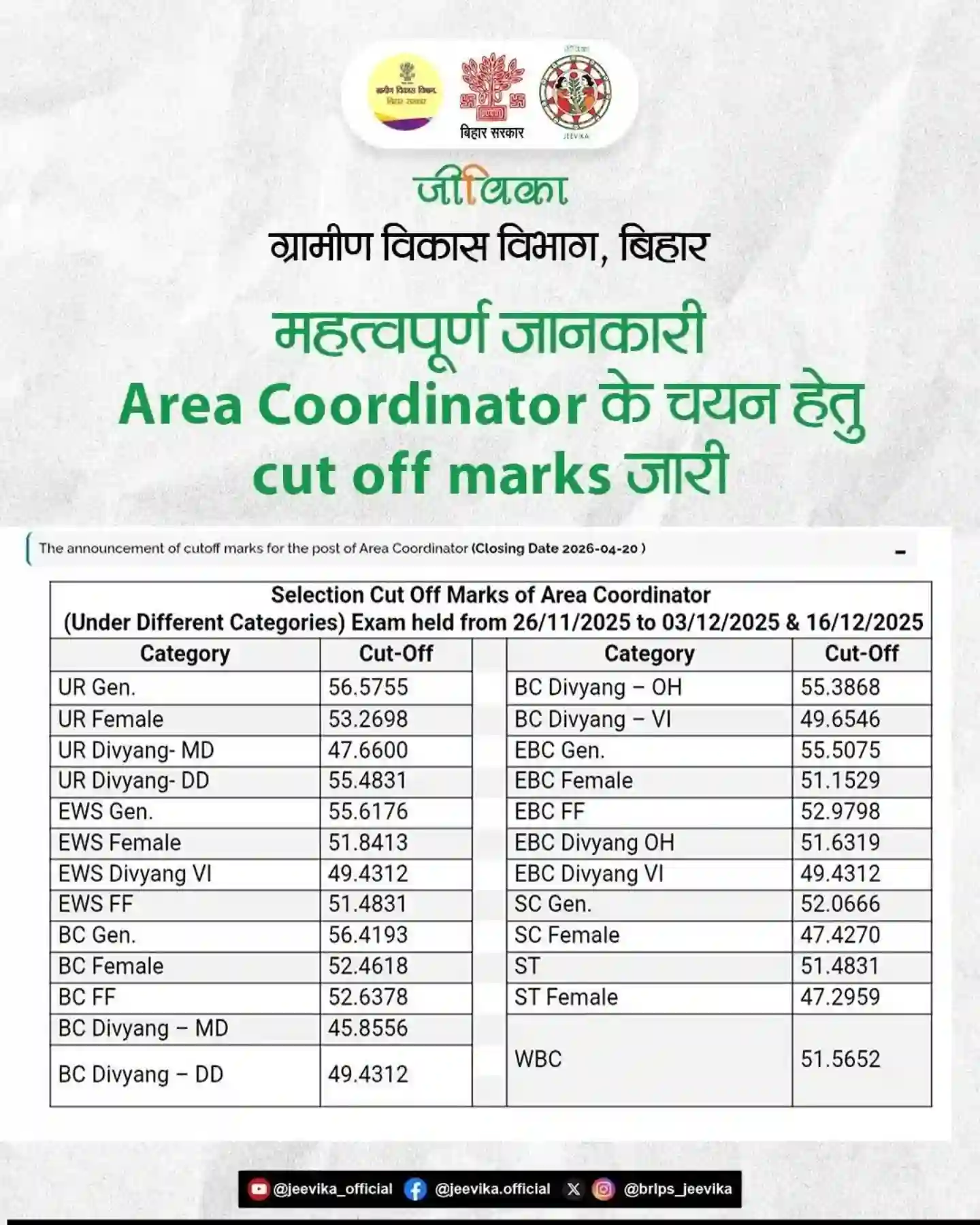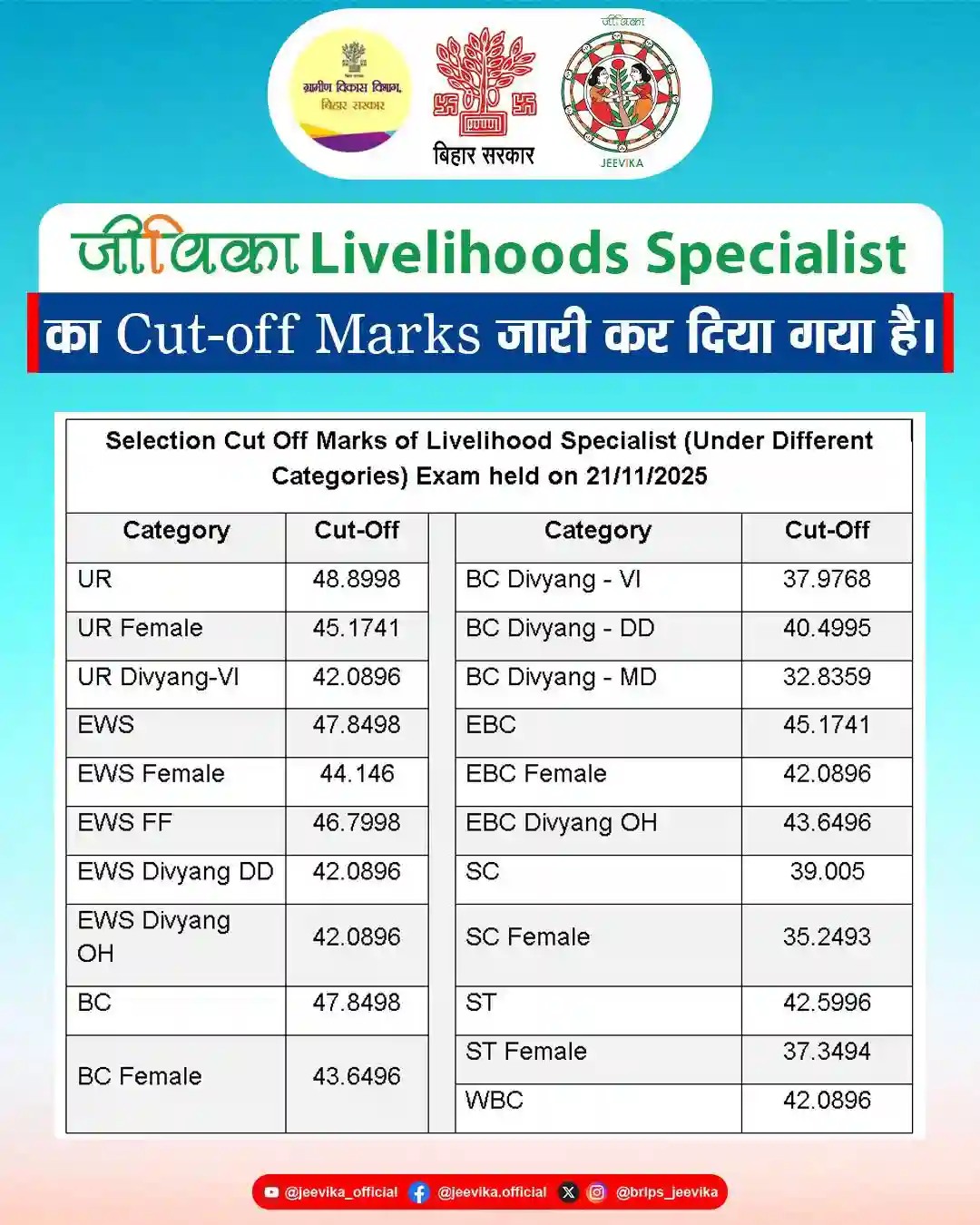 The Bihar JEEVIKA (BRLPS) has released the official category-wise cut-off marks for the Block Project Manager (BPM) post as of March 25, 2026. Candidates can check the minimum qualifying marks for UR, EWS, BC, and SC/ST categories to verify their selection status for the next recruitment stage.